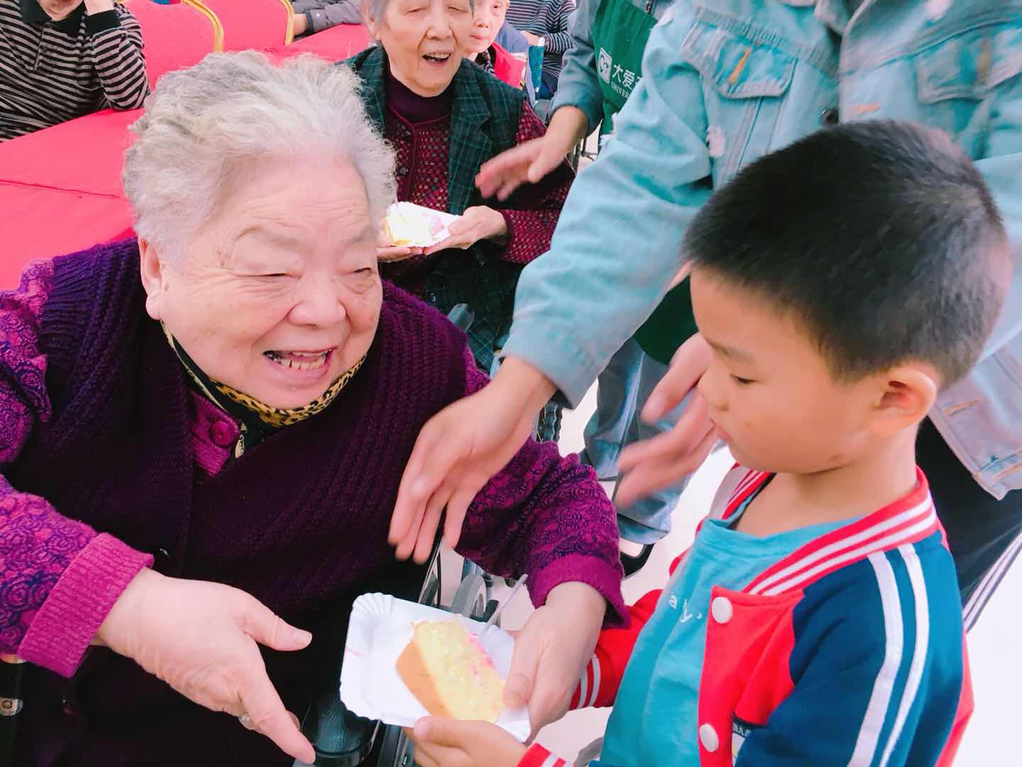 為發(fā)揚愛(ài)老精神,傳承中華美德,10月16日上午,實(shí)幼三園的大班師生來(lái)到金華綠城頤養中心和爺爺奶奶們共同慶祝九九重陽(yáng)節。雖天氣陰雨綿綿,爺爺奶奶們卻早早就在大廳內等候;顒(dòng)伊始,小朋友們就整整齊齊地向爺爺奶奶們問(wèn)好,奶奶們則自告奮勇上臺唱起了歌,講起了故事,其樂(lè )融融。小朋友們也為爺爺奶奶們獻上了精彩的表演。表演結束后,小朋友們?yōu)槔先藗儷I上了美味的節日蛋糕,唱起節日快樂(lè )歌,還精心準備了小零食,由他們親手送到爺爺奶奶手上。爺爺奶奶也將親手制作的漂亮愛(ài)心鏈子回贈給小朋友。