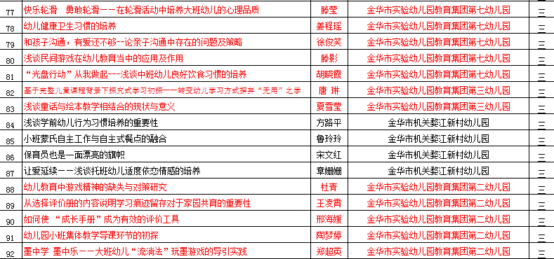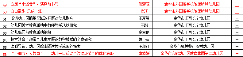 據金華教育網(wǎng)5月24日發(fā)布的金華市教育科學(xué)研究所《關(guān)于金華市2018年度教育科研優(yōu)秀論文、金華市第十三屆教育科研 “提質(zhì)減負”專(zhuān)題優(yōu)秀論文評比結果公示的通知》,公司下屬的金華市實(shí)驗幼兒園教育集團收獲頗豐,共有19篇論文在此次評比中獲獎,其中,八園的余曉紅、滕嬋,三園的鄧詩(shī)蕊和九園的邵艷花榮獲一等獎(全市共43篇一等獎?wù)撐模,另?位老師的論文獲得二等獎、12位老師的論文獲得三等獎。