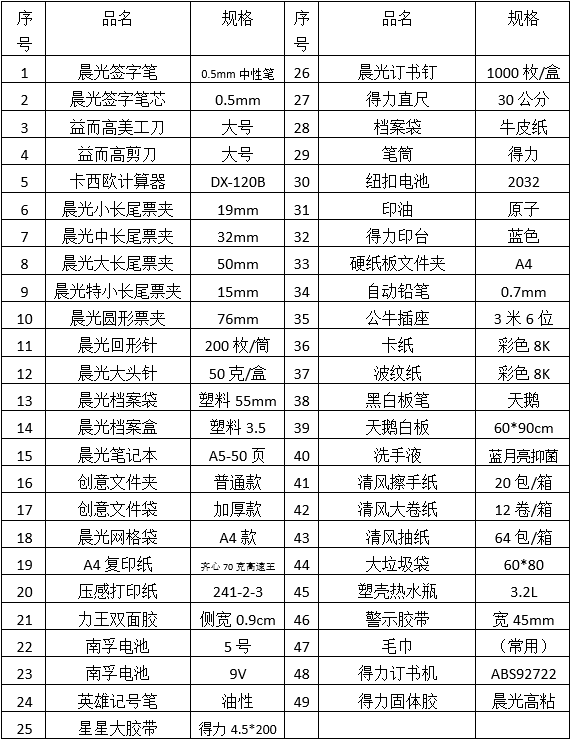 二、辦公用品清單及規格